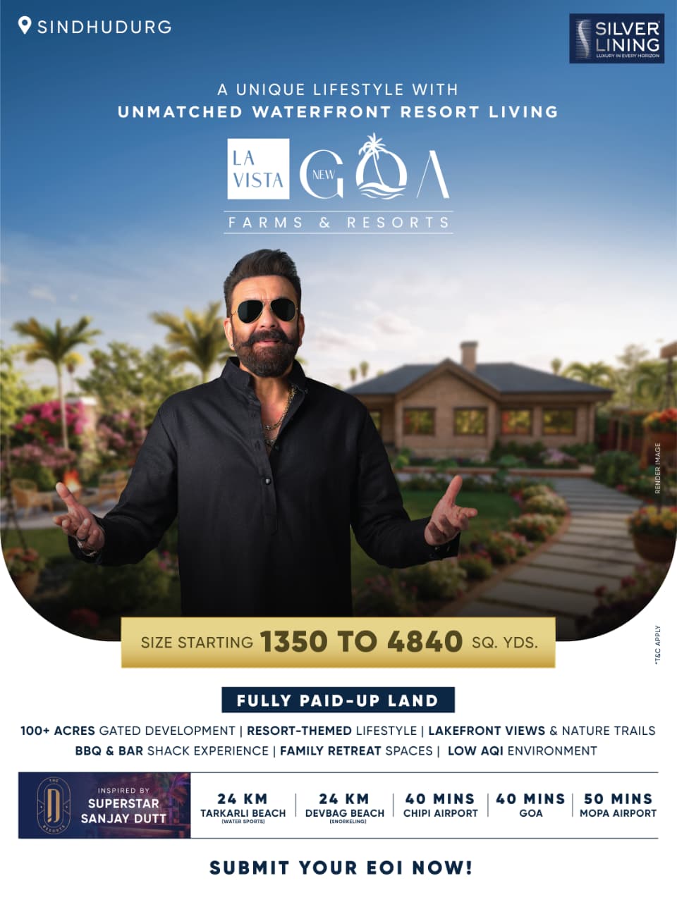 Welcome to La Vista Goa — Farms & Resorts, a prestigious project by Silver Lining Group located in the breathtaking Sindhudurg district, the gateway to New Goa. Spread across 100+ acres of lush, gated development, La Vista Goa offers resort-themed farmhouse living with lakefront views, nature trails, and a low AQI environment.